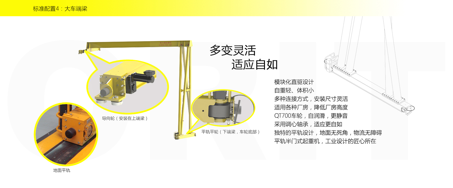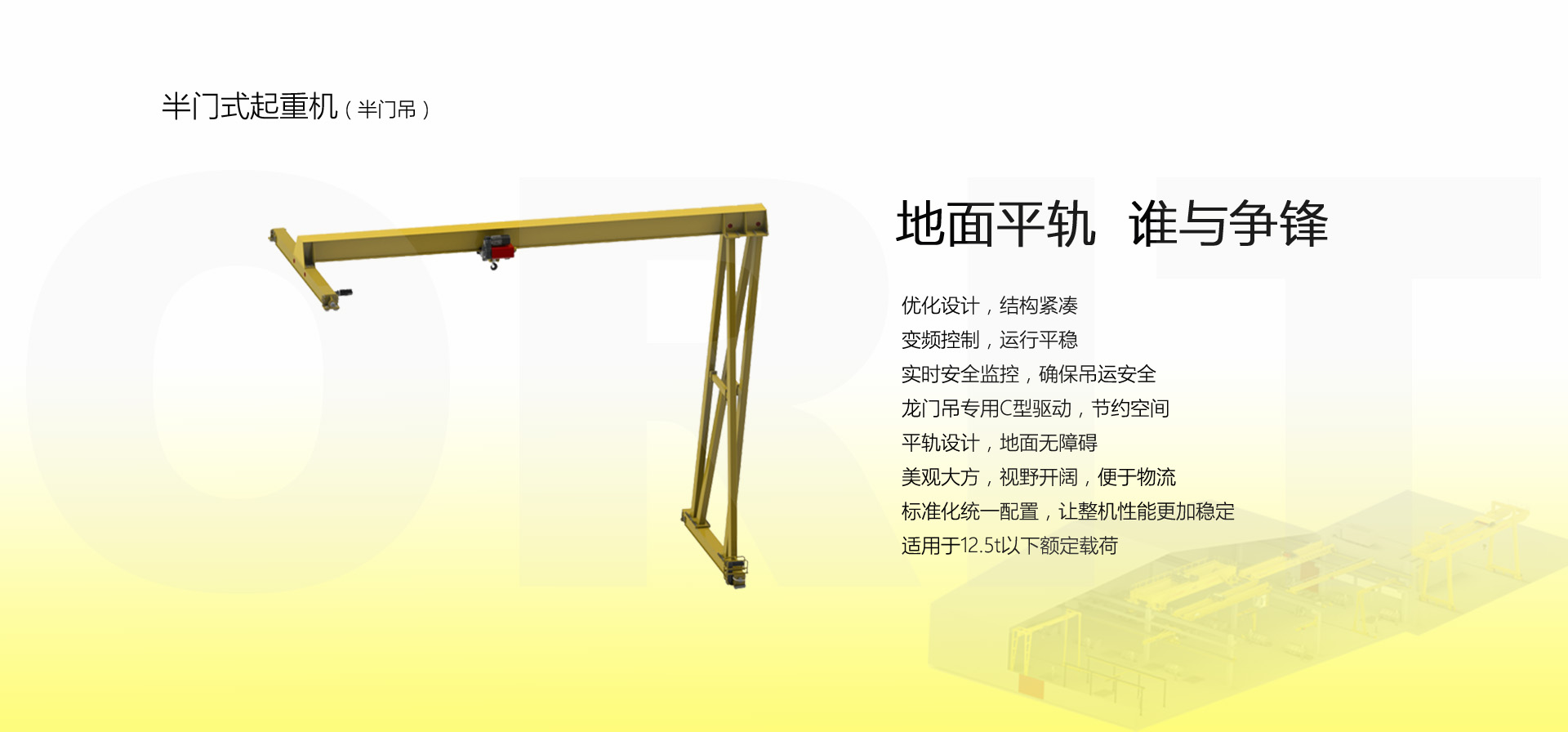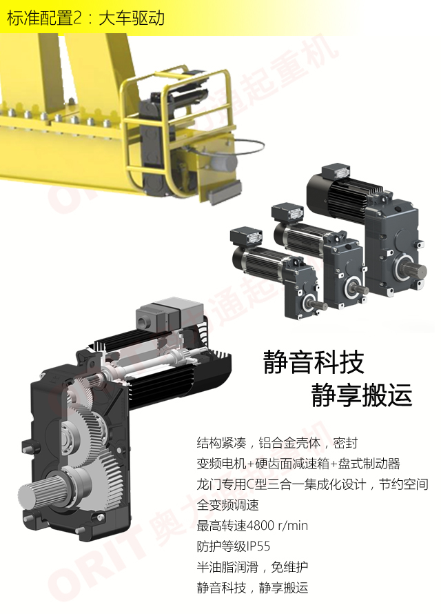 产品名称:半门式起重机 优化设计,结构紧凑 变频控制,运行平稳 实时安全监控,确保吊运安全 龙门吊专用C型驱动,节约空间 平轨设计,地面无障碍 美观大方,视野开阔,便于物流 标准化配置,让性能无比稳定 适用于12.5t以下额定载荷 标准配置1:起升机构 颠覆传统,自成一体 低净空设计 柔性驱动,内应力小,传动效率高 重级制电机,接电持续率60%ED 行走变频无极调速,运行平稳 自调试电磁盘式制动器,可靠,防尘 2160N/mm² 高强度镀锌钢丝绳,免维护 全周型导绳器,防松绳 全系标配安全监控系统 标准配置2:三合一驱动 静音科技,静享搬运 结构紧凑,铝合金壳体,密封 变频电机+硬齿面减速箱+盘式制动器 龙门专用C型三合一集成化设计,节约空间 全变频调速 最高转速4800 r/min 防护等级IP55 半油脂润滑,免维护 静音科技,静享搬运 标准配置3:电控系统 安全随心掌控 智能安全监控器 计算起升机构剩余安全工作时间 累计起升工作时间 累计超载次数 累计起升电机启动次数 起升电机过热保护及报警 刹车片厚度报警 ... ... 远程通讯 施耐德电气元件 航空插座接口 IP55防护等级 标准配置4:端梁 多变灵活,适应自如 模块化直驱设计 自重轻、体积小 多种连接方式,安装尺寸灵活 适用各种厂房,降低厂房高度 QT700车轮,自润滑,更静音 采用调心轴承,适应更自如 独特的平轨设计,地面无死角,物流无障碍 平轨半门式起重机,工业设计的匠心所在